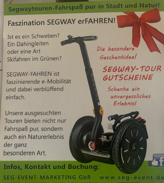 Die Aufmerksamkeit ist garantiert um ein Vielfaches höher und Sie kommen ungezwungen mit Ihren Interessenten ins Gespräch. Nutzen Sie SEGWAY als innovativen Werbeträger! Mehr